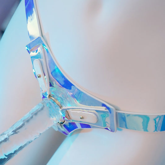 Stunning Aurora Blue PU Leather Strap on Harness with Clear Silicone Dildo