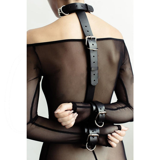 Slave Bondage Leather Neck to Wrist Back Restraint Collar with Handcuffs