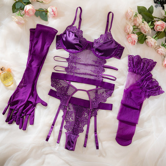Sexy Lace Corset Garter Belt 4 Piece Lingerie Set Purple