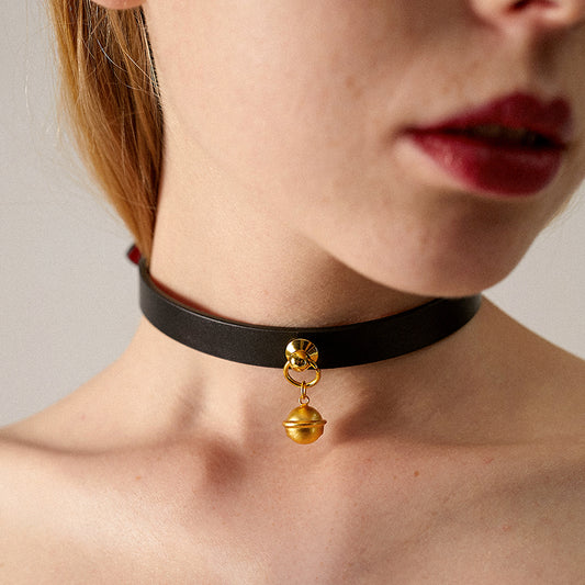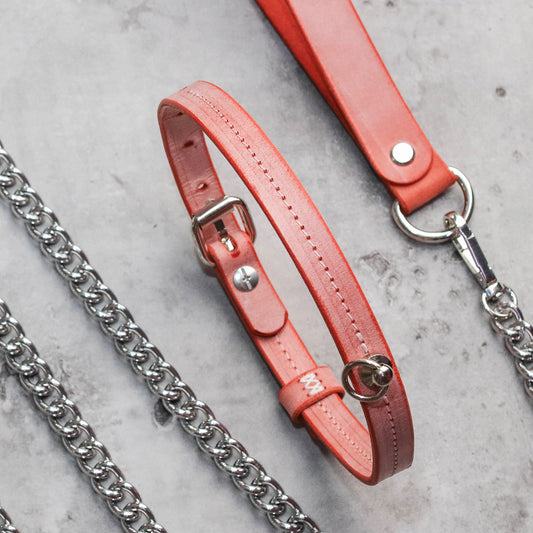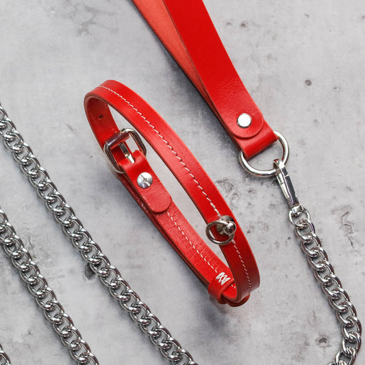 Minimalist Cowhide Leather BDSM Collar with Sterling Silver Bell and Leash Black&Red