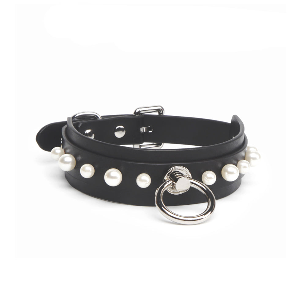 Elegant White Pearl Leather Bondage Collar with Leash Pink/Black